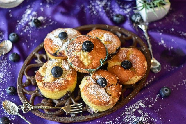 7. Mafini z borovnicami so pripravljeni na postrežbo, ko se ohladijo. Pred postrežbo jih lahko posujete s sladkorjem v prahu.